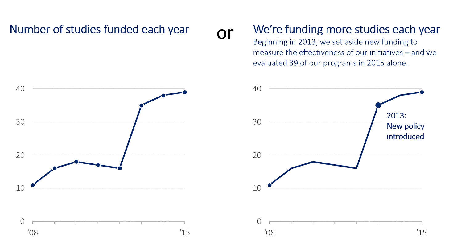 Now look at the right side. Same data. Same chart. But this time, there is a simple note: “2013: New policy introduced.”
